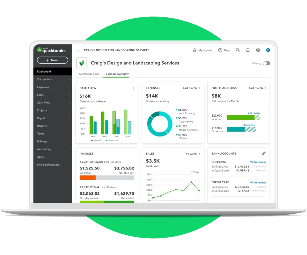 Con QuickBooks, nuestra plataforma principal, podrás administrar fácilmente tus finanzas empresariales, realizar un seguimiento de los ingresos y gastos, facturar a clientes, llevar un registro de inventario y generar informes financieros claros.